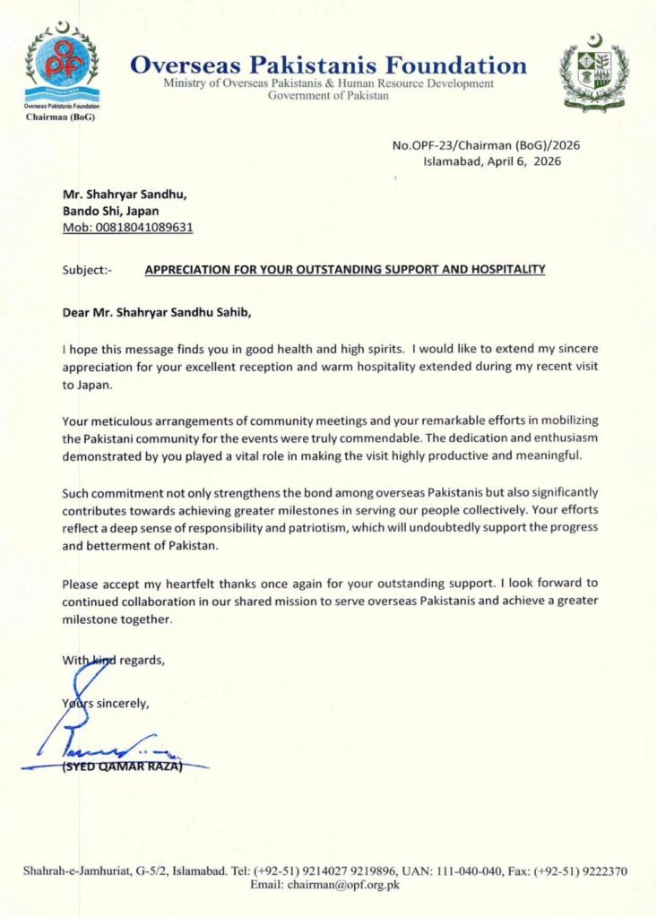 According to the letter issued from Islamabad on April 6, 2026, the OPF Chairman highly praised Shahryar Sandhu for his meticulous organization of community meetings and his exceptional role in bringing together the Pakistani community for various events. He noted that Shahryar’s dedication, enthusiasm, and tireless commitment played a vital role in making the Japan visit highly productive, meaningful, and successful.