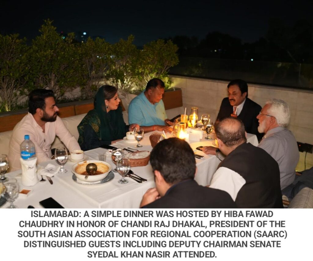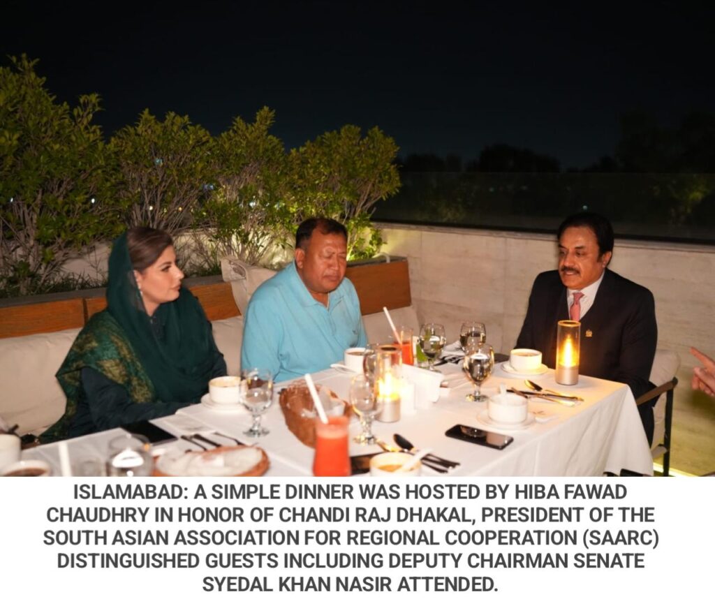 A formal dinner was hosted by Hiba Fawad Chaudhry in honour of the President of the South Asian Association for Regional Cooperation SAARC, Chandi Raj Dhakal. The event was attended by the Deputy Chairman Senate Syedaal Khan Nasar along with other distinguished guests.